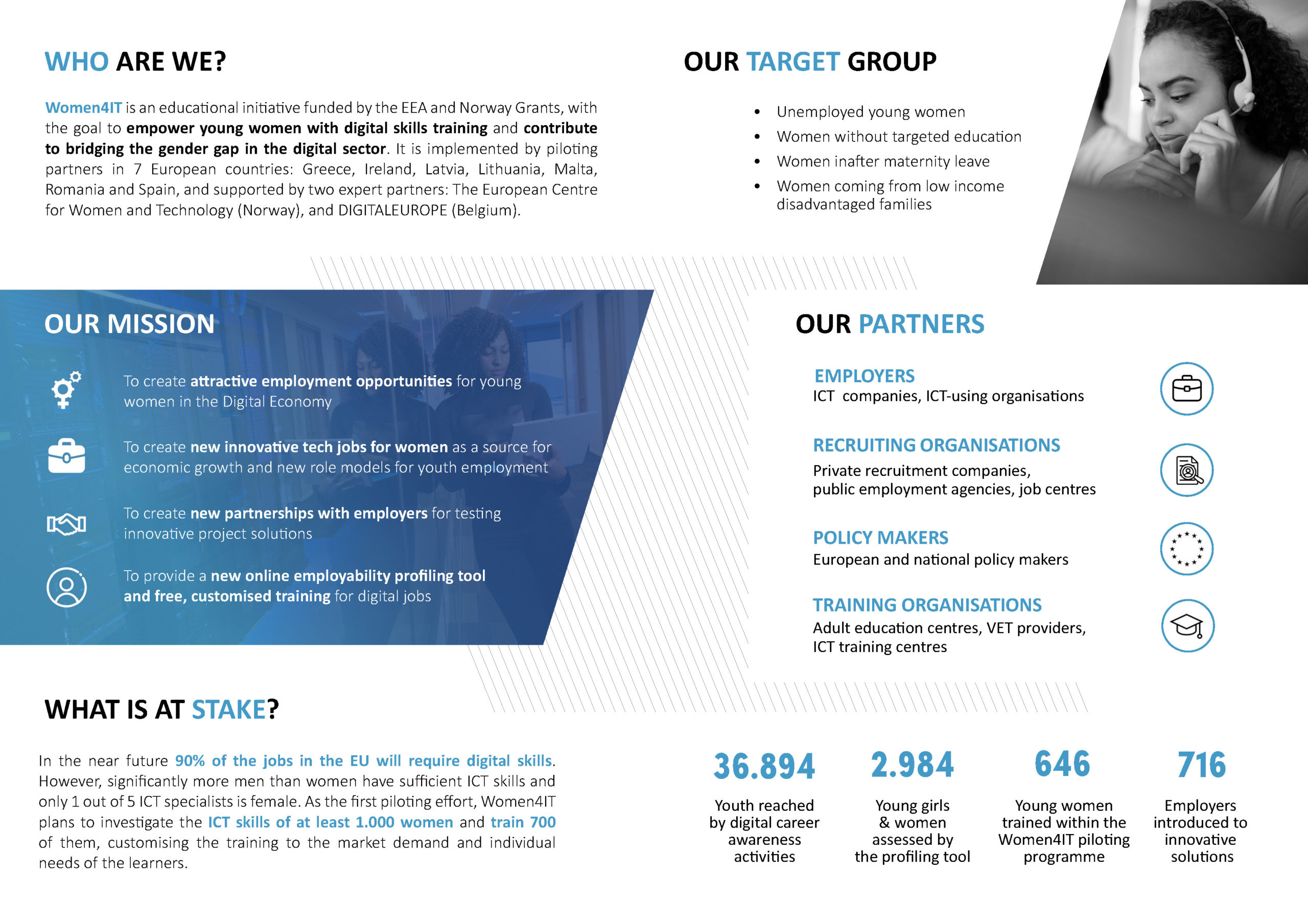 The main focus of the Women4IT project, funded by the EEA and Norway Grants Fund for Youth Employment  (2018-2022), is to develop and pilot innovative training solutions, making digital skills education inclusive for all young women, especially those from a NEET background (NEET – not in employment, education or training).
