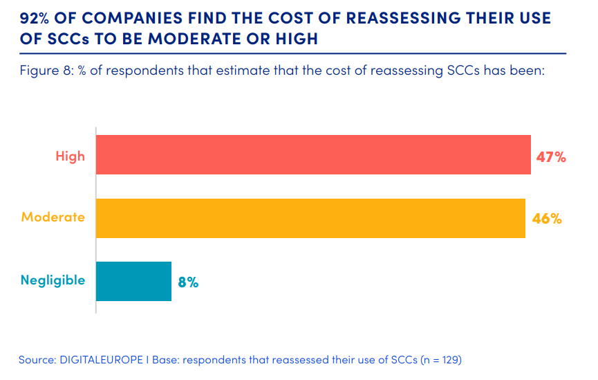 • Nine in ten companies that have reassessed their use of SCCs to comply with the ruling consider that the cost of doing so is moderate or high. Only half of estimated SCC users have reassessed their use of SCCs.