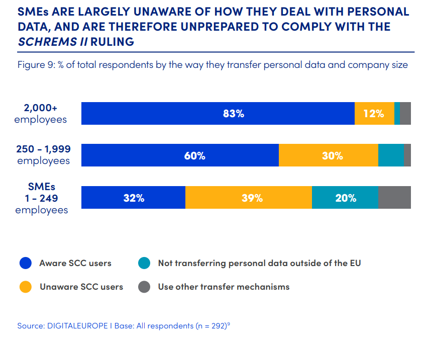 • 25 per cent of respondents appear not to be aware that they transfer data outside of the EU, most likely through SCCs. This is despite the fact that most contributions to the survey have come from data protection or compliance professionals. SMEs are more likely to be in this group but almost a quarter of bigger companies are also affected. This proves a fairly widespread lack of understanding about personal data transfers and the ensuing obligations, which may expose companies to sanctions for GDPR infringement.