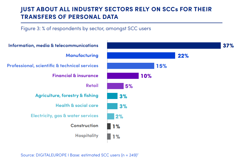 • The information and communications technology (ICT) sector is the single largest user (37 per cent), but just about all industry sectors rely on SCCs for their transfers, with manufacturing coming in second (22 per cent).