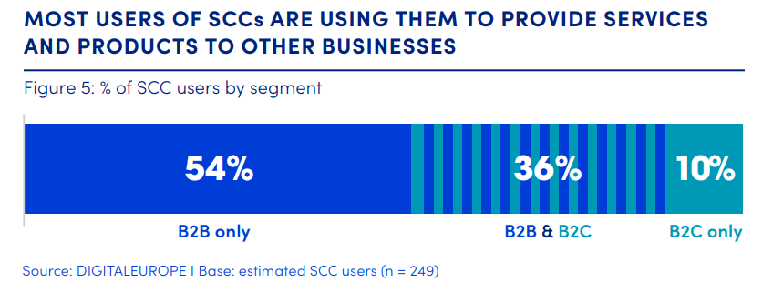 Data flows and SCCs are part and parcel of long business value chains. Most companies using SCCs do so to provide services and products exclusively to other businesses, followed by companies that also provide direct services to consumers. Only a minority of respondents are pure consumer-facing companies.