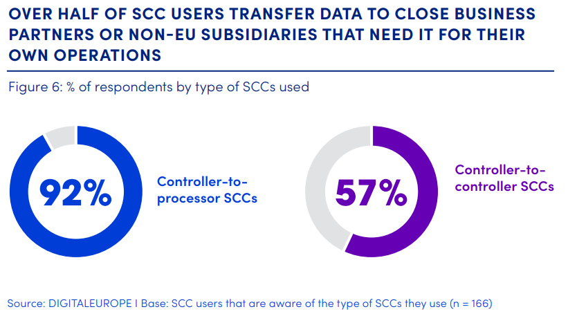While most companies using SCCs transfer data to ‘processors’ (other entities that process data based strictly on the transferring company’s instructions, for example for payroll management), more than half among them also transfer data to one or multiple other ‘controllers’ (entities that will use the data independently, for example for their own manufacturing or sales operations). These can be non-EU subsidiaries or close business partners.