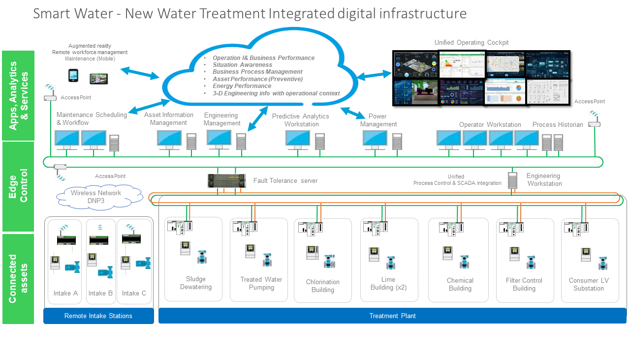 It offers a single view of assets and systems across the utility by the integration of IT/OT. This gives the ability to provide consolidated and contextualized insight on the whole enterprise performance for decision support. It enables an integrated approach unifying sites, people, process, assets and technology for a more efficient and effective use of water, energy and assets. Its advantages lie in a centralised control of the infrastructure, optimised operations and workforce empowerment through collaboration, training and knowledge-sharing.