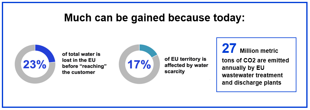 • water produced and “lost” before reaching the customer is on average 23% of total net water produced in the EU.[3]
