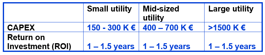 [18] These estimates also assume the water utility is already equipped with a SCADA system. SCADA is an acronym for supervisory control and data acquisition. It gathers and analyses real- time data from water assets and water process. Were the utility not already have SCADA in place, decision-makers should add 50-100 K for a small utility, 2000-3000 K for a mid-sized utility and 5000 K for a large utility. We estimate SCADA investments for water utilities, mainly about hardware for connectivity and automation, to generate ROI in less than 3 years.