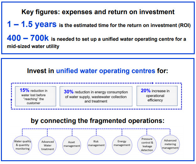 The investment for a unified water operating centre varies according to the size of the water utility and the number of citizens it serves. Typically, it ranges from 150-300 K euro for a small infrastructure to more than 1.500 K euro for a large infrastructure. Experience also shows the payback on those investments is quick.
