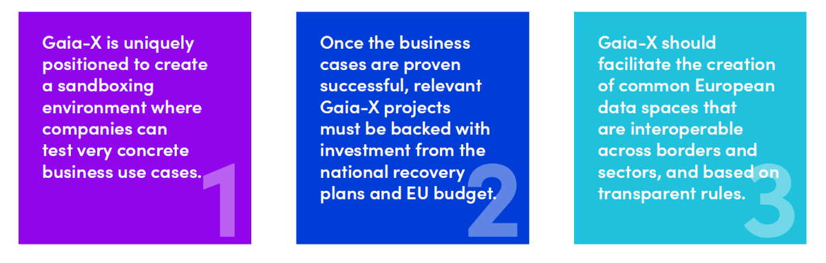 1. Once the business cases are proven successful, we need a quick rollout. Relevant Gaia-X projects must be backed with investment from the national recovery plans and EU programmes to accelerate uptake.